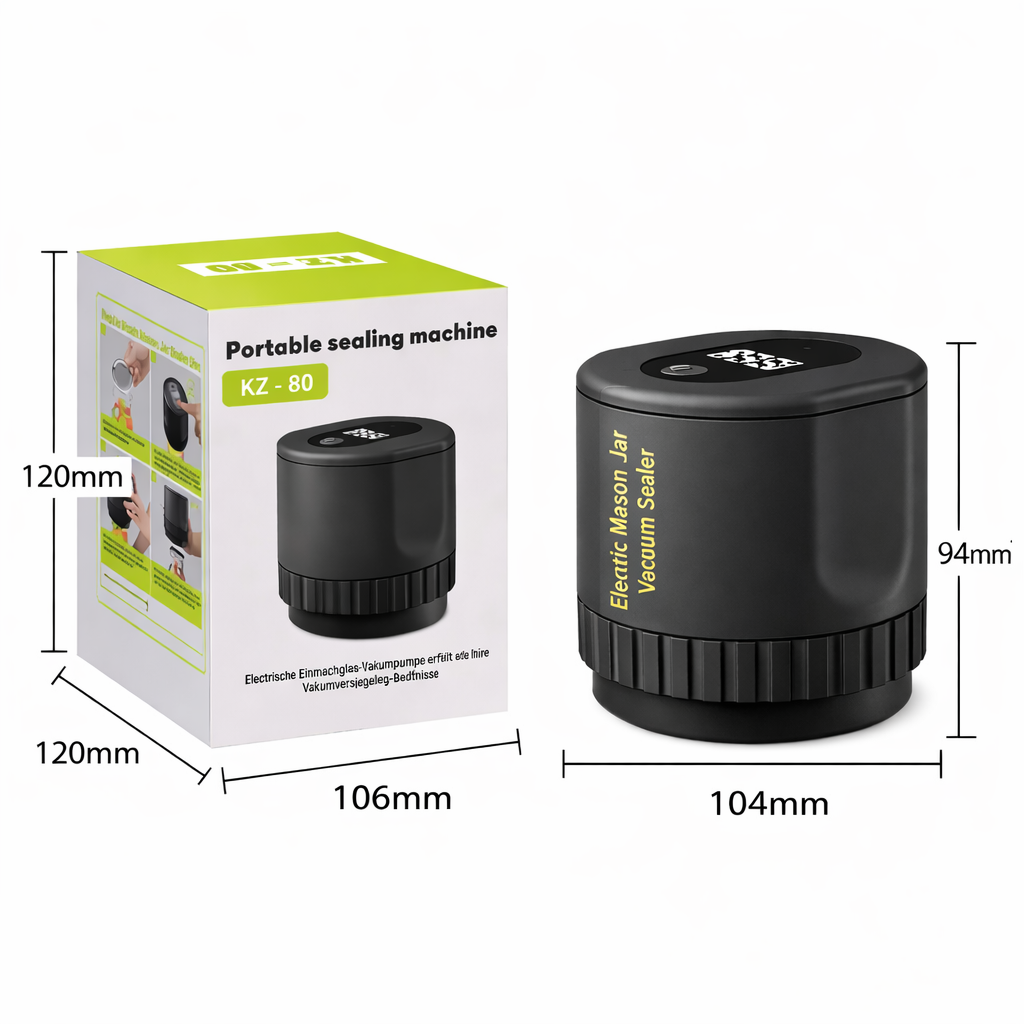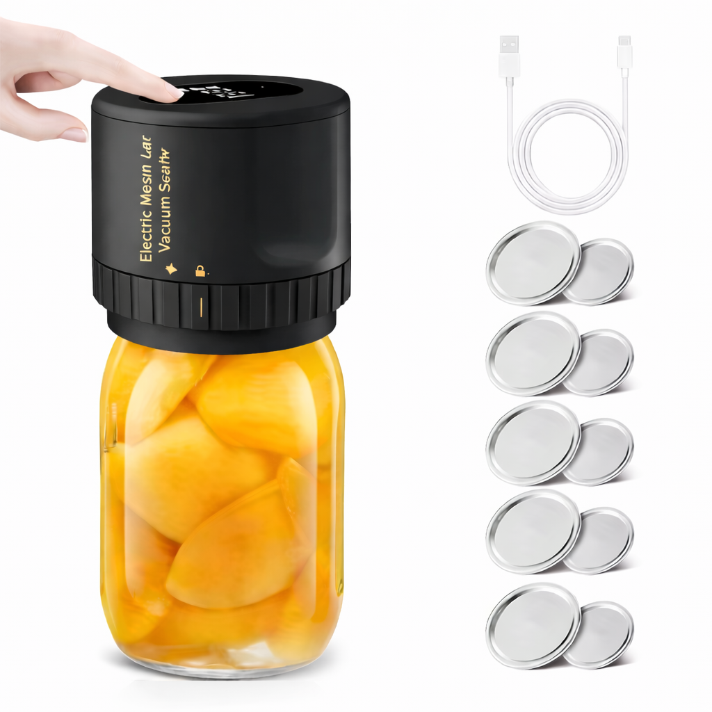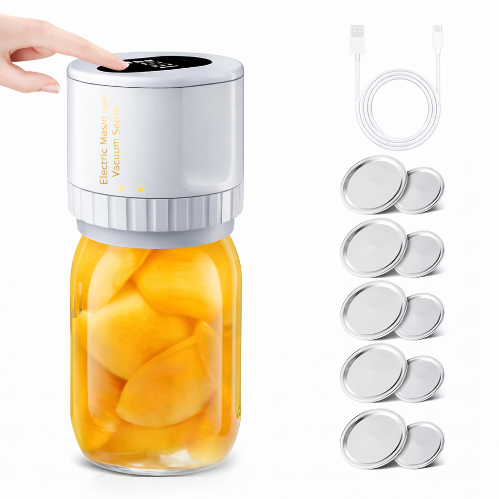 Halte deine Lebensmittel länger frisch und aromatisch mit unserem kabellosen elektrischen Vakuumierer. Dank der 70 mm und 86 mm Adapter passt das Gerät auf die meisten Mason-Jar-Gläser und ermöglicht eine einfache, luftdichte Aufbewahrung. So reduzierst du Lebensmittelverschwendung und organisierst deine Vorräte schnell und effizient.
